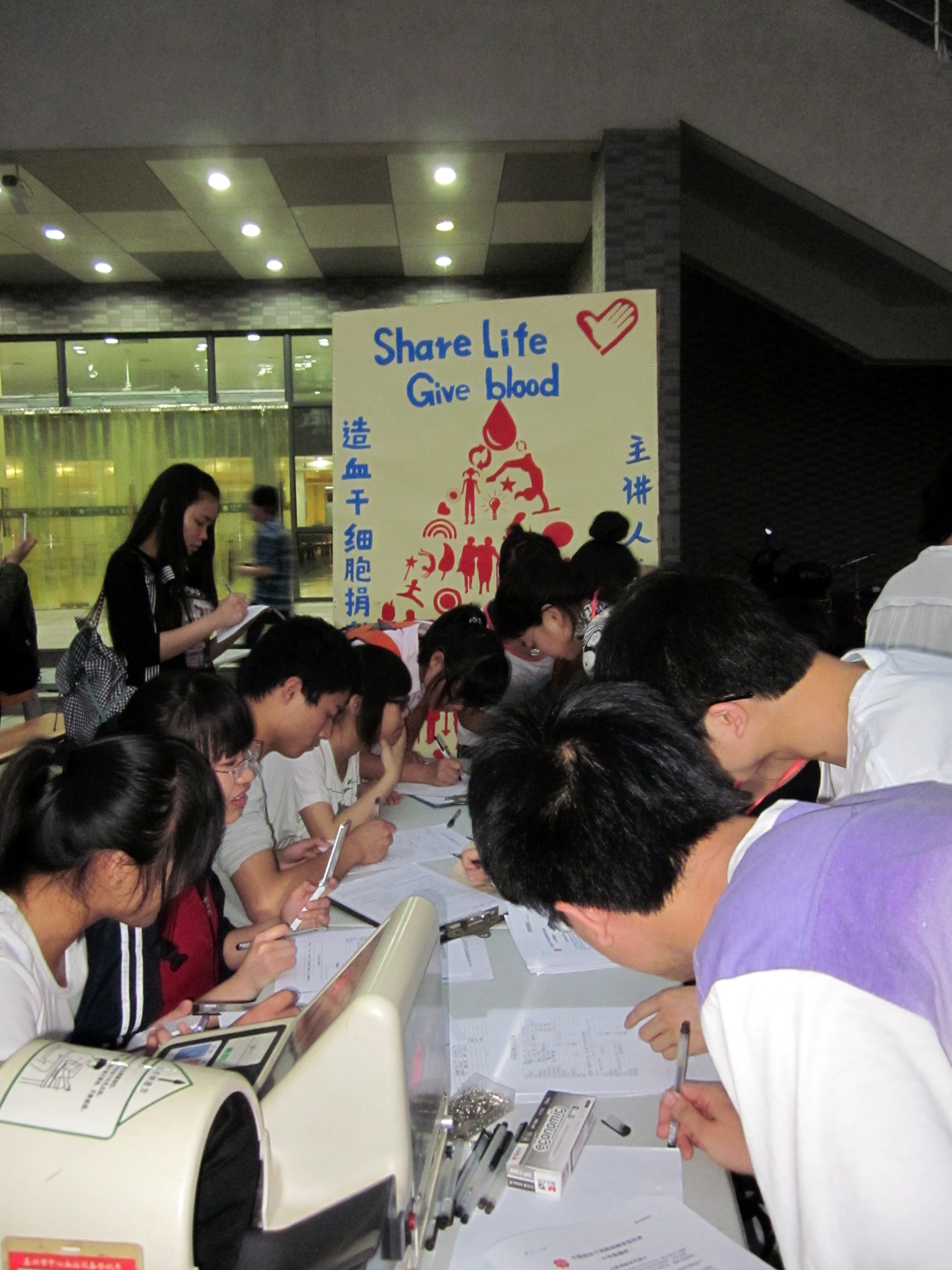 活动现场共有25名同学踊跃献出200ml血液,38名同学经抽取10ml血样无偿捐献造血干细胞,加上前天晚上献血的17名同学,目前共有55名同学志愿加入中华骨髓库。从献血车到捐献造血干细胞现场,处处上演着一幕幕爱心奉献的动人场景。