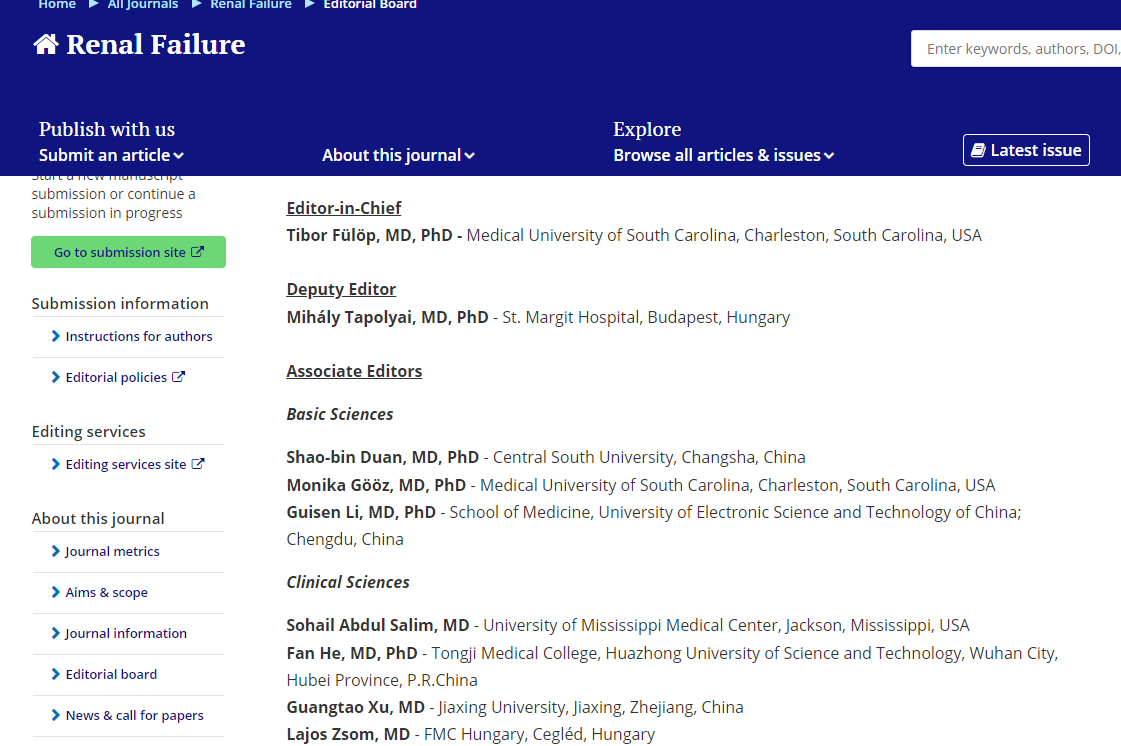 徐广涛副教授应国际期刊Renal Failure邀请,担任该期刊副主编(Associate Editor)。