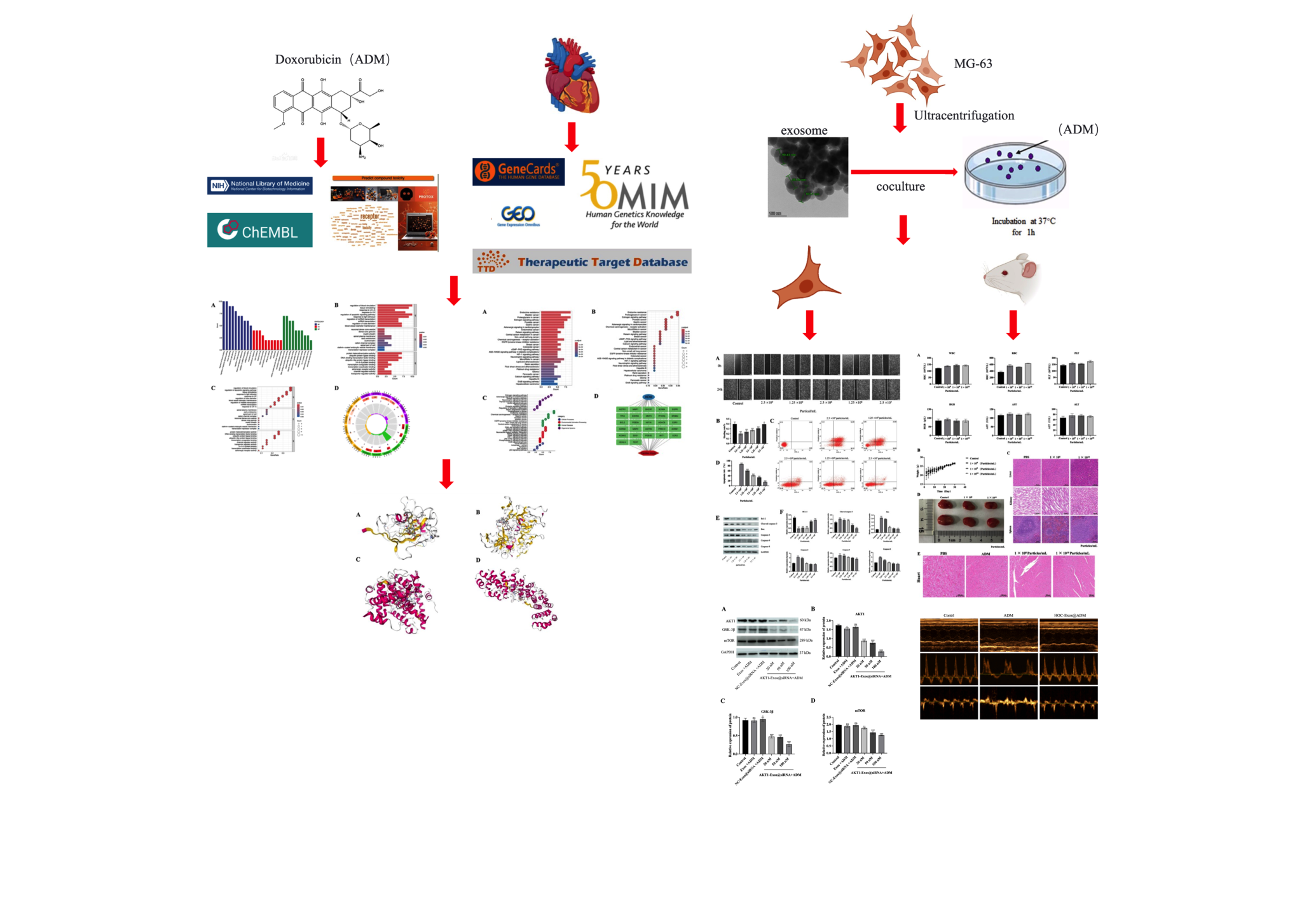 骨肉瘤(OS)侵袭性强、预后差,多柔比星(ADM)虽有效但因心脏毒性受限。本研究旨在探究 ADM 致心脏损伤机制,并开发外泌体介导的药物递送新策略以降毒。通过网络毒理学和分子对接技术,从公共数据库构建靶点库,经韦恩图分析确定ADM与心脏损伤的27个共同靶点(含 AKT1、TP53 等),涉及凋亡、氧化应激和炎症等过程,GO 和 KEGG 分析揭示相关生物学过程。此外,从人骨肉瘤 MG-63 细胞分离外泌体,并负载ADM得到 HOC-Exos@ADM。体外和体内模型评估显示,该递送方式提高药物摄取量,增加骨肉瘤细胞凋亡;AKT1 表达降低会减少 GSK-3β 和 mTOR 信号通路蛋白表达,致心肌细胞损伤,而此递送方式在动物模型中更安全。结果表明,外泌体递送系统可降低ADM心脏毒性,改善骨肉瘤患者临床结局。