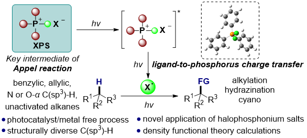 C(sp3)–H键的直接官能团化是有机合成中的核心挑战之一,传统方法往往依赖贵金属催化剂或苛刻的反应条件,限制了其在绿色合成中的应用。可见光催化作为一种环境友好的策略,近年来在药物分子修饰和功能分子构建中展现出巨大潜力。卤代鏻盐作为经典Appel反应中的中间体,以往主要用于醇的卤代反应,其光化学性质与多功能性尚未被充分发掘。