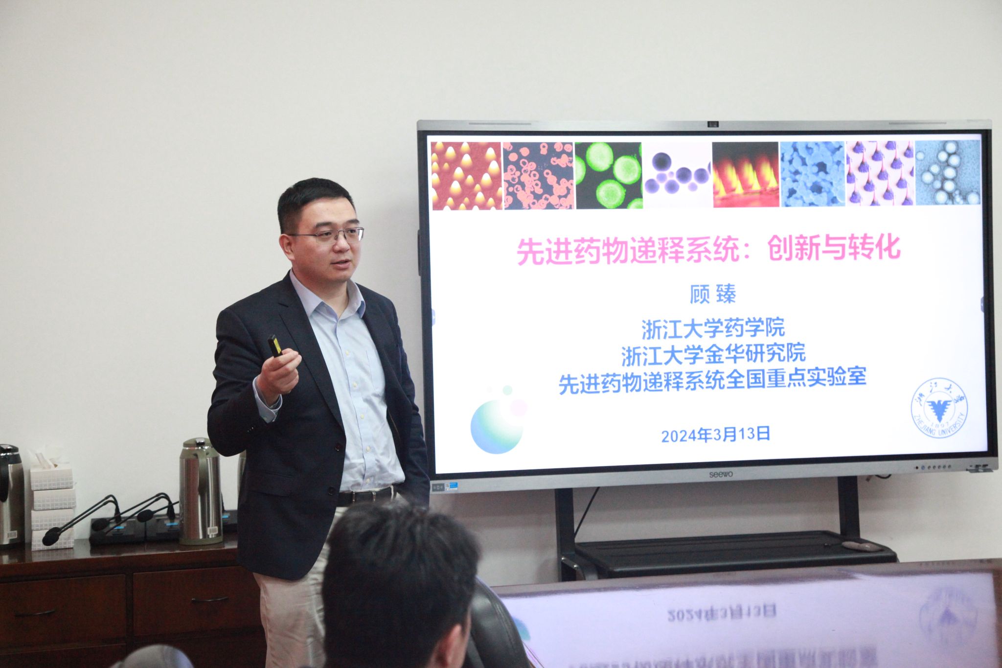 顾臻教授以“先进药物递释系统:创新与转化”为题作专题讲座。他从研究团队首次报道的葡萄糖响应性“智能胰岛素贴片”、新型I-insulin微针和模拟胰岛细胞仿生递药系统的研发进展;生理响应性微针在青春痘、毛发再生、黑色素瘤等医美方面的应用;基于肿瘤微环境和CAR-T等免疫治疗的靶向给药系统;基于血小板、脂肪细胞和可喷涂凝胶等新型制剂的研发进展等方面进行详细讲授。顾臻教授团队将疾病相关生理信号与响应性生物材料结合构建多种智能给药体系并且部分已成功实现产业化。此外,他还分享了在创新药物临床和产业转化方面的心得体会。