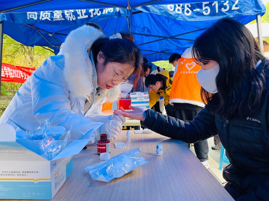 防艾宣传活动现场,来自嘉兴市疾控中心、嘉兴学院附属妇儿医院、嘉兴市城南卫生院的老师们为同学们做防艾知识宣传,发放宣传单页和安全套,开展指尖采血,进行乙肝、丙肝、梅毒、艾滋病的快速检测。