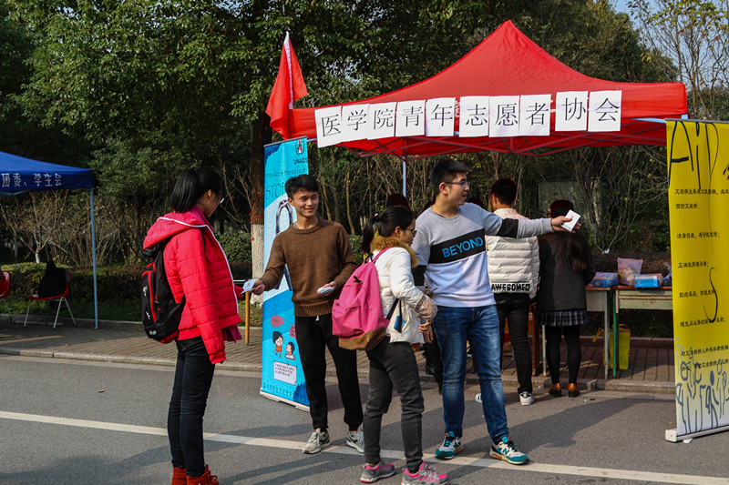 2016年12月1日,嘉兴学院九色视频 青年志愿者协会在梁林校区老食堂门口和越秀校区笨笨熊广场举办了以“相拥艾人”为主题的防艾活动。