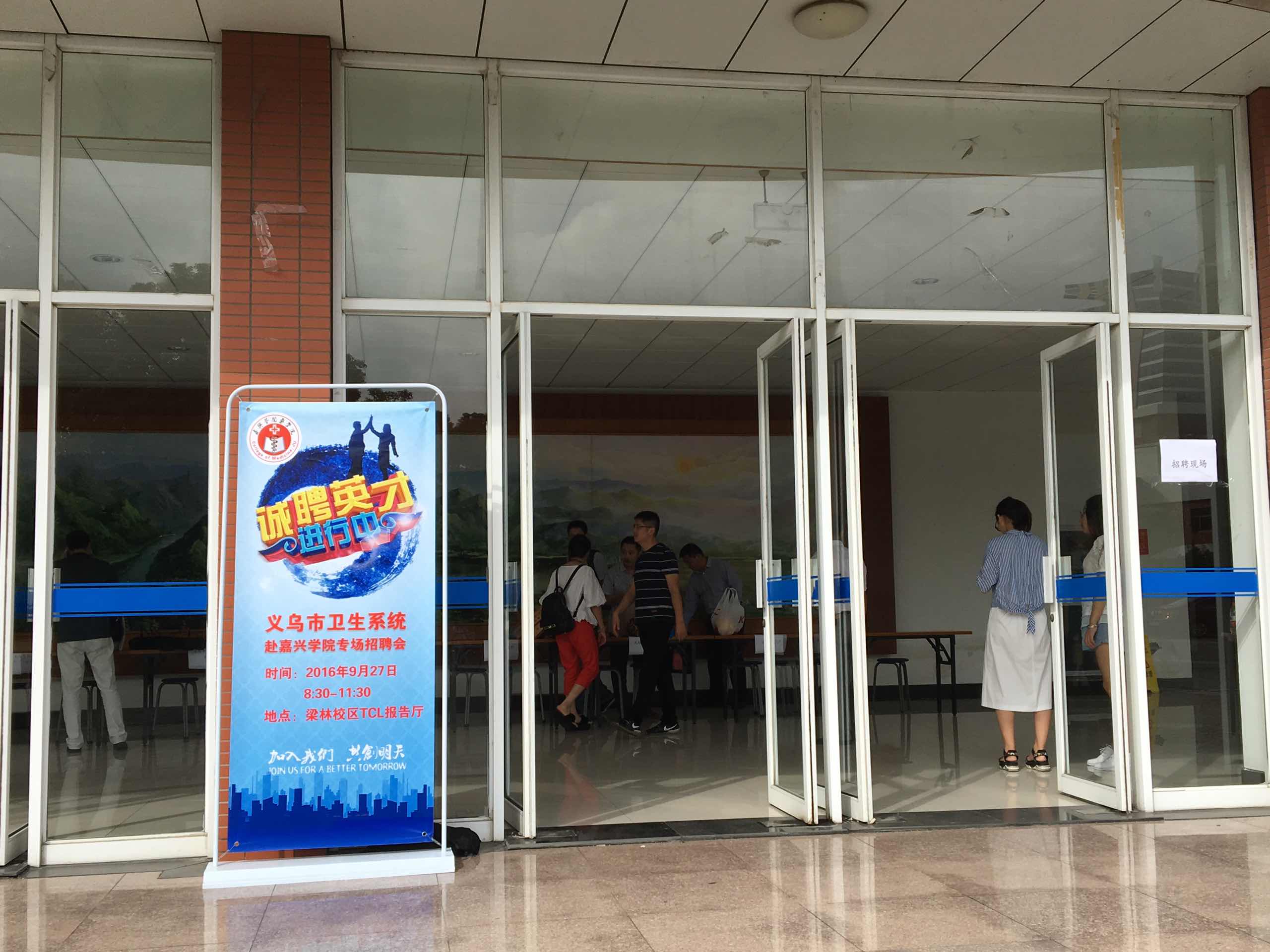2016年9月27日,我院在梁林校区TCL报告厅成功举办义乌市卫计系统专场招聘会。招聘会定于上午8:30开始,但是上午八点刚过,就陆陆续续有学生来现场咨询,并当场报名上交简历。经过两个多小时的沟通交流,然后报名递交简历。紧接着,下午义乌市卫计系统对报名同学进行了现场笔试和面试。 经过激烈的角逐,义乌市卫计系统最终确定了岗位人选,此次招聘会,顺利结束。