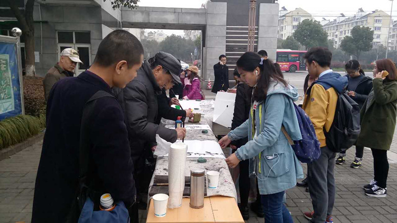 2016年3月13日下午13:30,嘉兴学院九色视频 书画协会在嘉兴学院梁林校区门口举办了主题为“占尽春色在此间”的书画笔会,届时请来了鸳鸯湖诗社韩振良、王志南、方遒、张建浩、张建林、王印芳、刘学明、毛发荣、胡尚尧、高贤、张楚等十几位老师与我院近百名大学生共话书画,同追风雅。