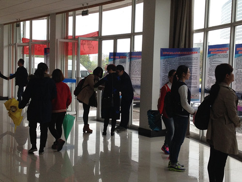 2016年4月7日,我院在梁林校区TCL报告厅成功举办海宁市卫计系统专场招聘会。招聘会定于上午9:00开始,但是上午八点半刚过,就陆陆续续有学生来现场咨询,并当场报名上交简历。经过两个多小时的沟通交流,然后报名递交简历,海宁市卫计系统共收到几十份简历。下午海宁市卫计系统对报名同学进行了现场面试。