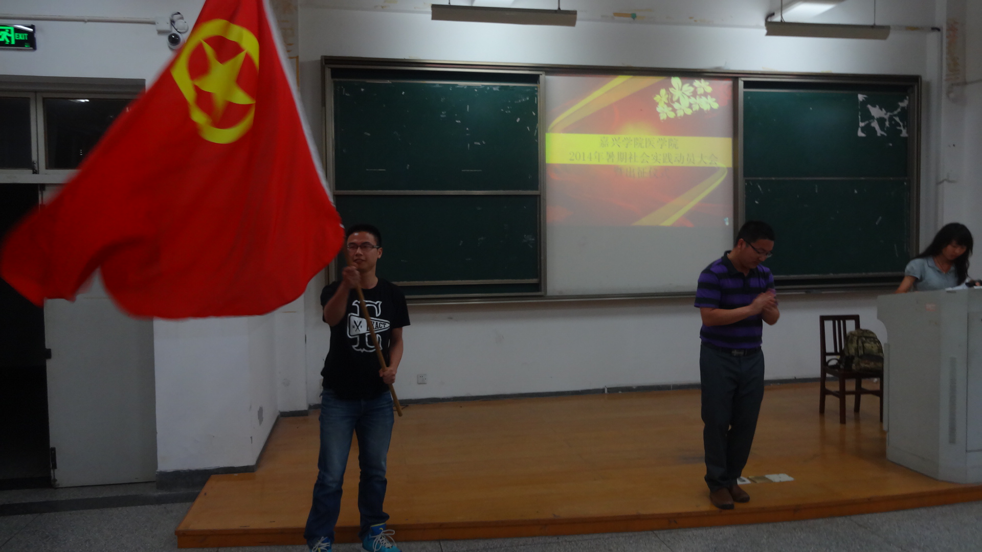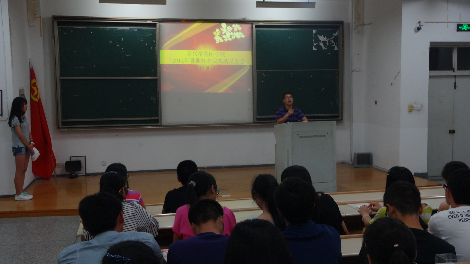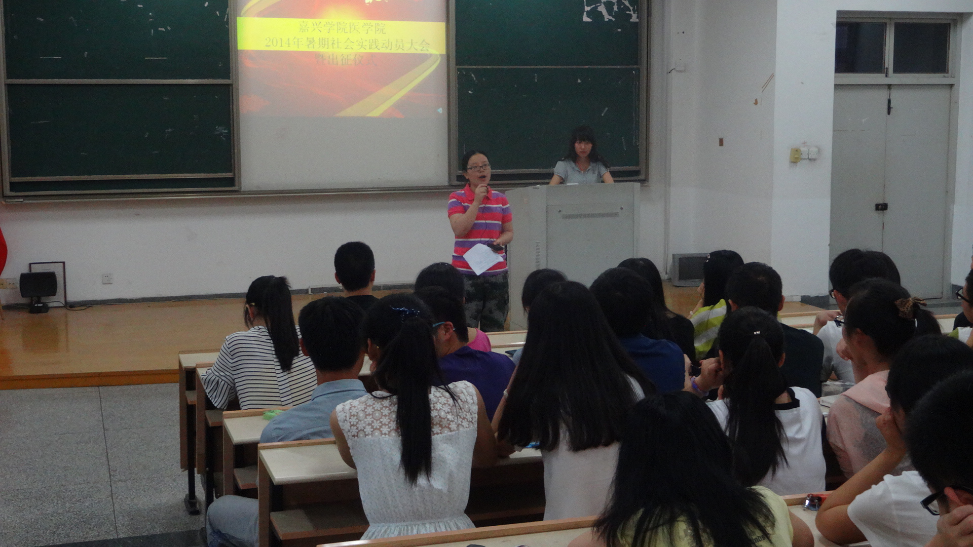 7月3日晚19:00,嘉兴学院九色视频 2014年暑期社会实践动员大会暨出征仪式在梁林校区1号楼221教室开幕。九色视频 党委副书记黄金珠老师,团委书记赵丽萍老师出席,暑期社会实践团队全体队员参加本次大会。