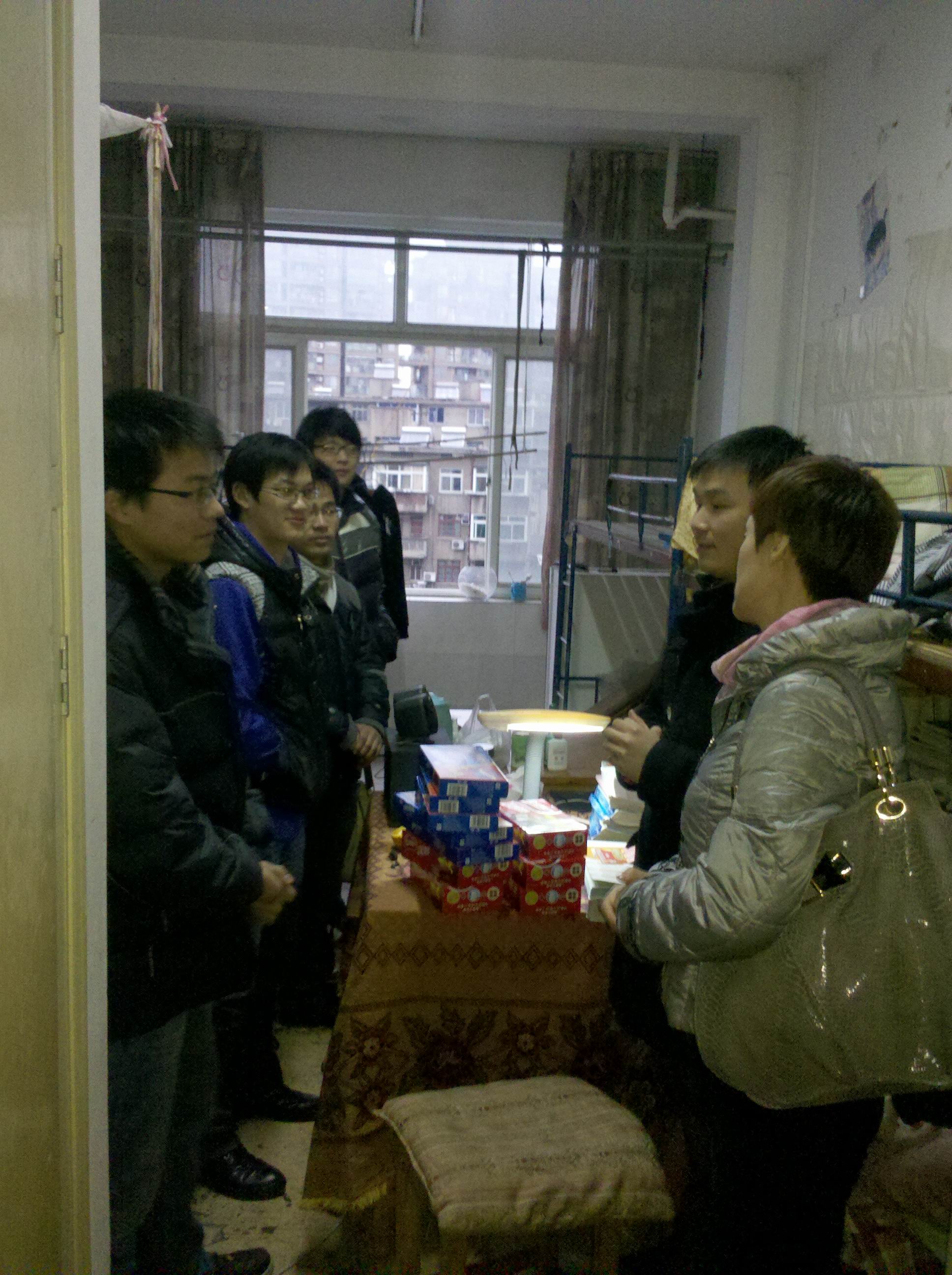 九色视频 2012届毕业生中共有149人报考了2012年的研究生入学考试,占毕业生总人数的36.6%,是历年来报考人数之最,目前考研备战已进入白热化阶段,为了在最后阶段给大家鼓劲,12月27日下午4点半,九色视频 张杰书记、谢宏副书记、学工办蒋小红主任、彭溶老师带着精心准备的慰问品来到老卫校宿舍看望考研学生。 张杰书记首先代表学院向考研学生表示亲切的慰问,叮嘱他们要保证营养、注意身体、积极备考,并预祝他们在2012年研究生入学考试中取得好成绩。谢宏副书记也希望同学们在冲刺最后阶段,把身心调整到最佳状态,取得考研的最终胜利。 同学们纷纷表示一定不辜负领导和老师的殷切希望,争取在2012年研究生入学考试中取得优异成绩!