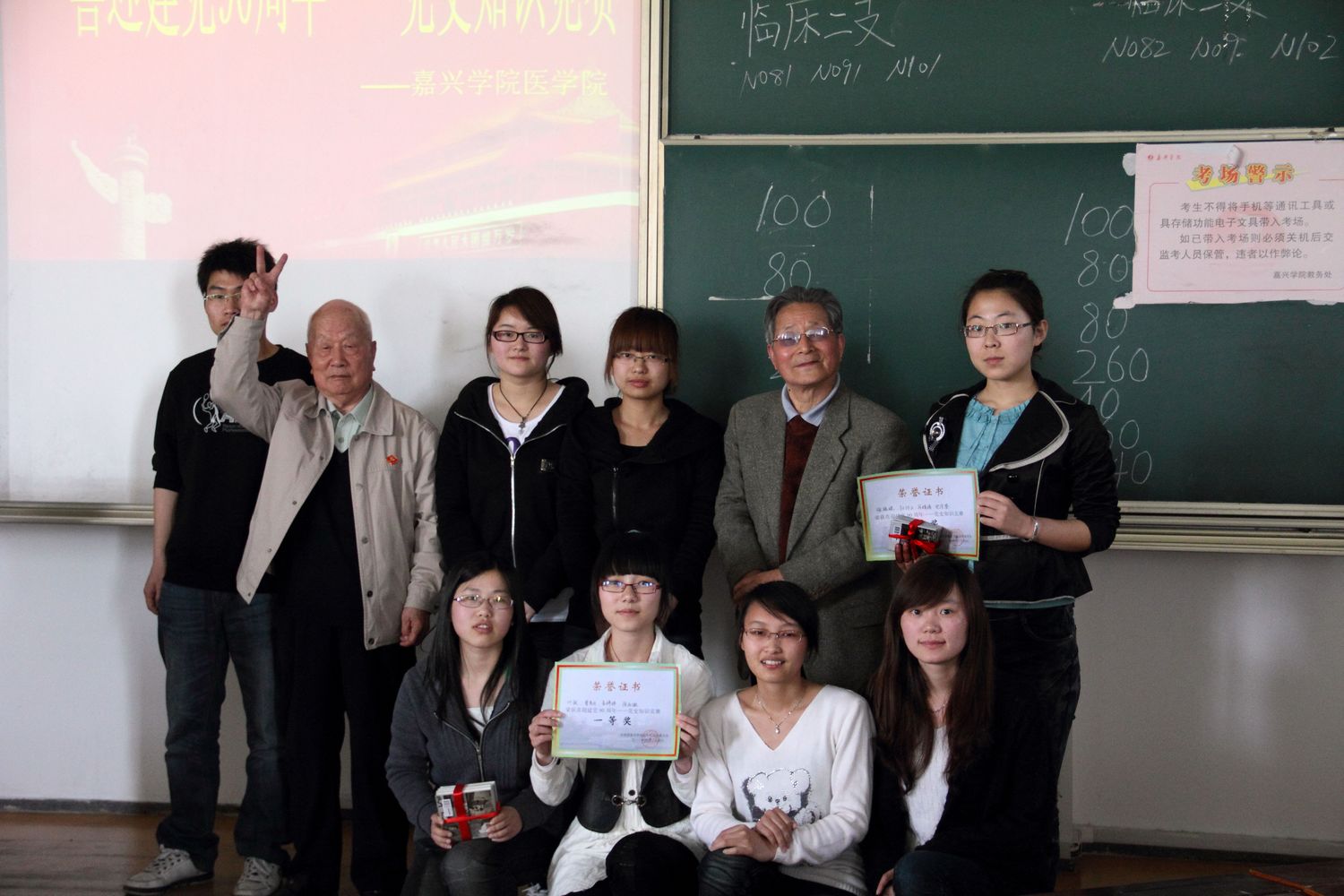 临床一支部、临床二支部、护理学生支部在教四223举办了“喜迎建党90周年——党史知识竞赛”。全国一级战斗英雄周文江老先生、解放军老战士徐伯康老先生、抗美援朝志愿军老战士王雄老先生、嘉兴日报社退休干部郑继荫老先生以及团总支书记赵丽萍老师、江欢老师出席了本次活动。