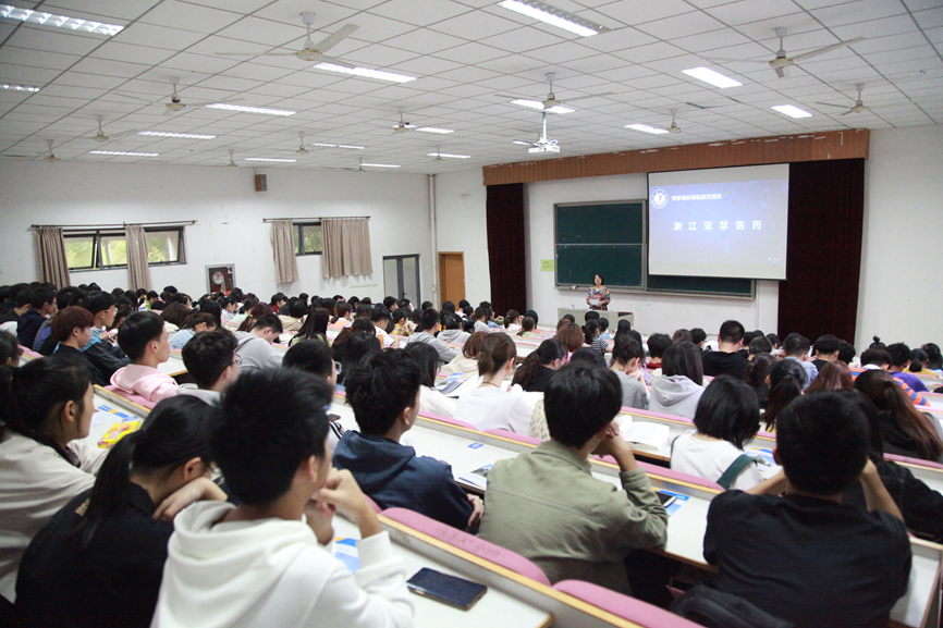 在13号报告厅举行“药学成长导航—走进浙江亚瑟医药”活动。浙江亚瑟医药董事长刘洪斌博士、亚瑟研究院院长刘世领亚瑟医药常务副总经理景林涛、亚瑟医药国际BD总监谢锋、药学系系主任黄越燕副教授及药学系教师代表、全体药学专业学生、浙江亚瑟医药部分员工代表参加了本次活动。