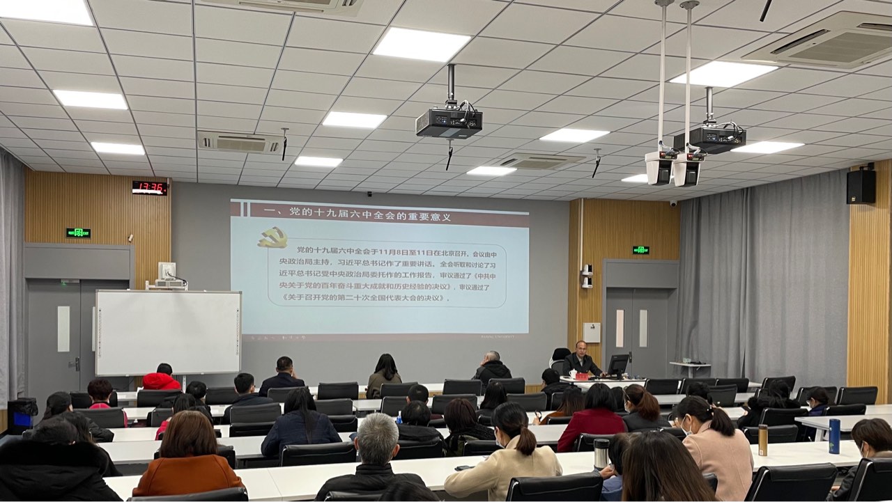 宣讲党的十九届六中全会精神。学院党政领导班子、全体教师党员以及部分教师代表参加,学院党委书记陈云飞主持会议。