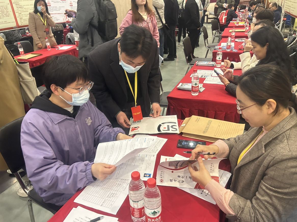 三位老师在嘉兴学院的招聘海报前向前来咨询的硕博士人才介绍嘉兴学院的基本情况,解答他们的疑问,与他们进行沟通和交流。