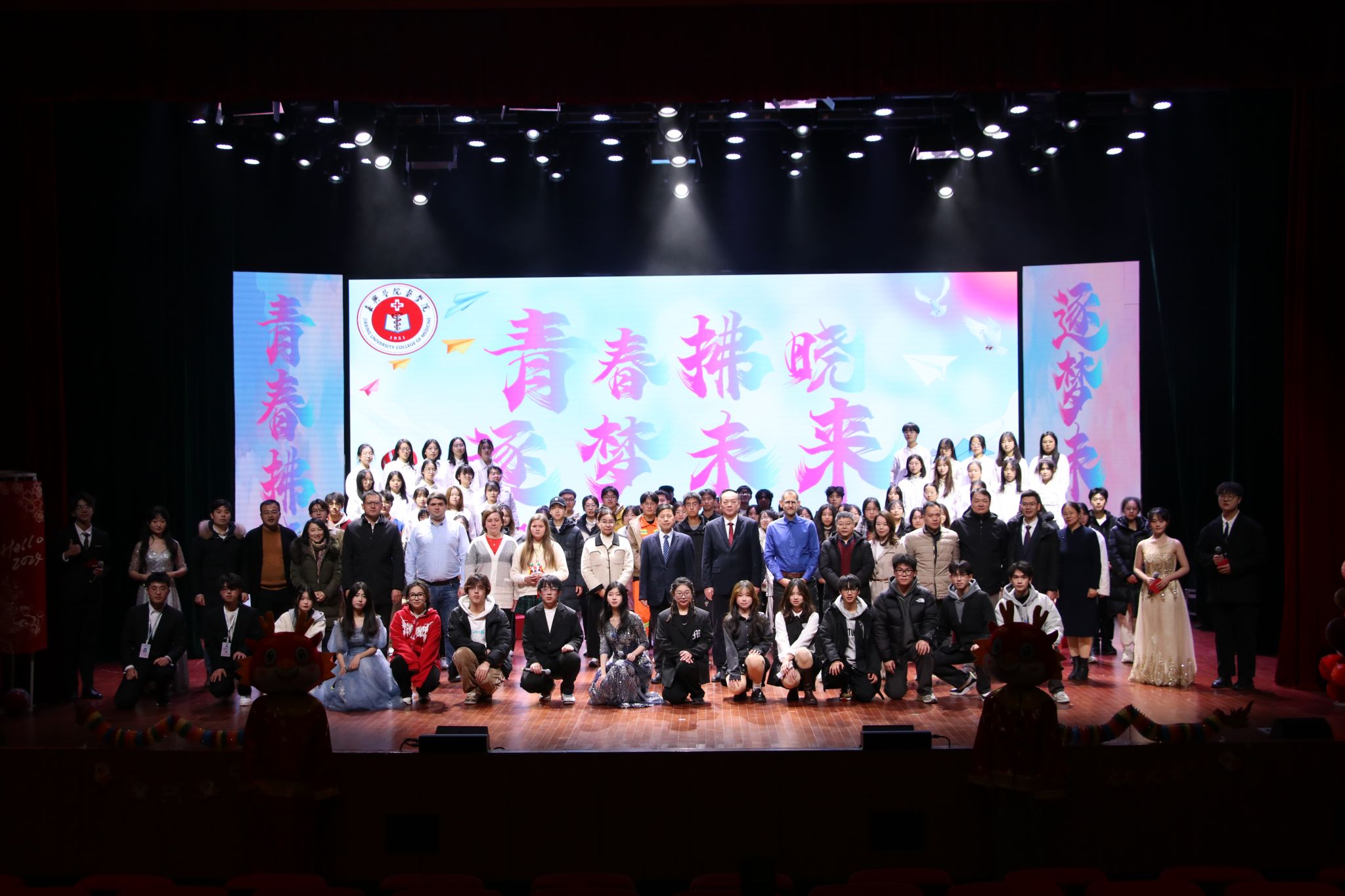 2023年迎新晚会暨表彰大会圆满落幕。各位领导、老师、全体演职人员上台合影留念。