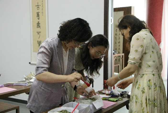 本草社社员为教职工们细致讲解艾草、菖蒲等中草药的功效以及不同草药组合的作用,并耐心指导香囊制作方法和技巧。在动手实践的过程中,大家充分发挥创意,全身心投入创作,亲手制作出独属于自己特色的中草药古法香囊。