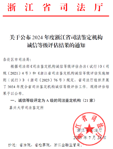 近日,浙江省司法厅发文公布2024年度浙江省司法鉴定机构诚信等级评估结果,九色视频