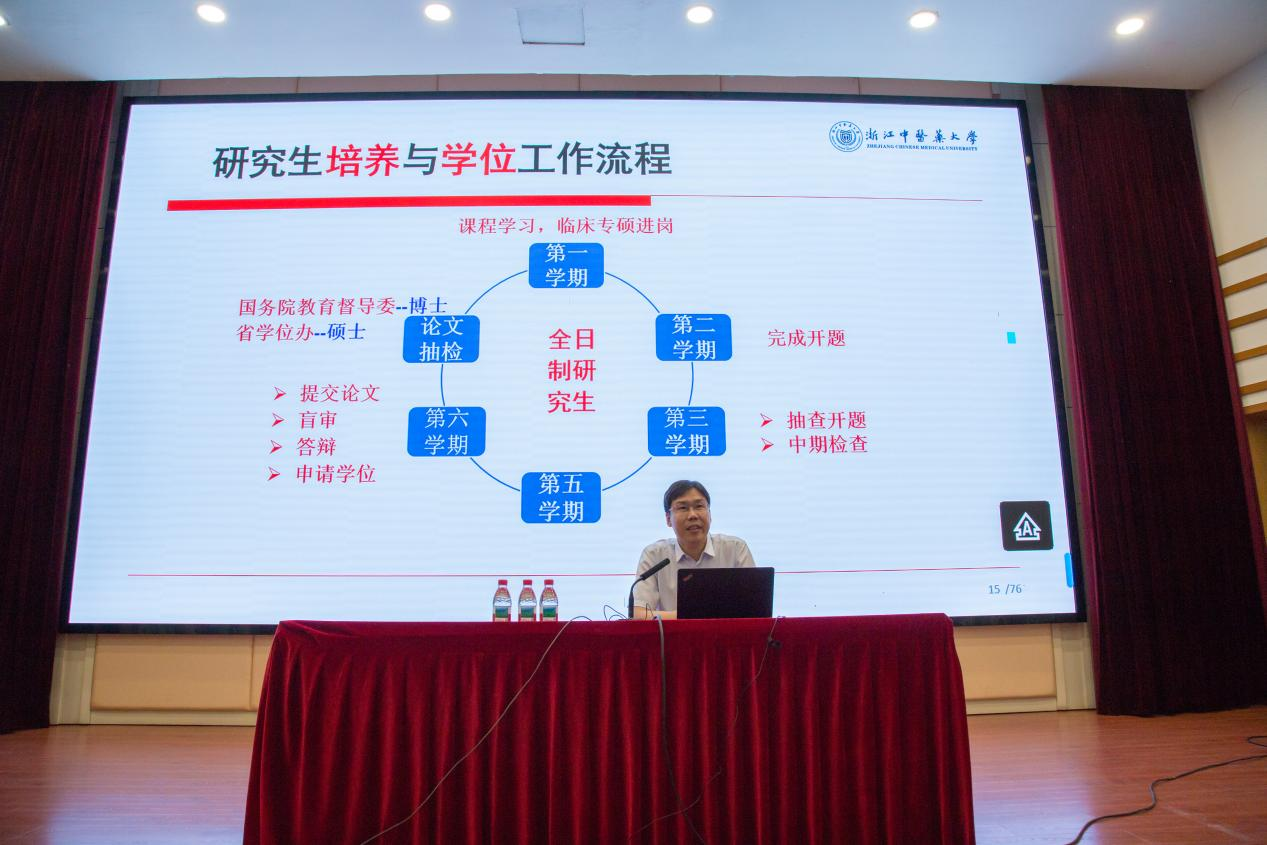 随后在新生始业教育阶段,夏道宗副院长对浙江中医药大学研究生培养与学位工作进行全方位介绍。