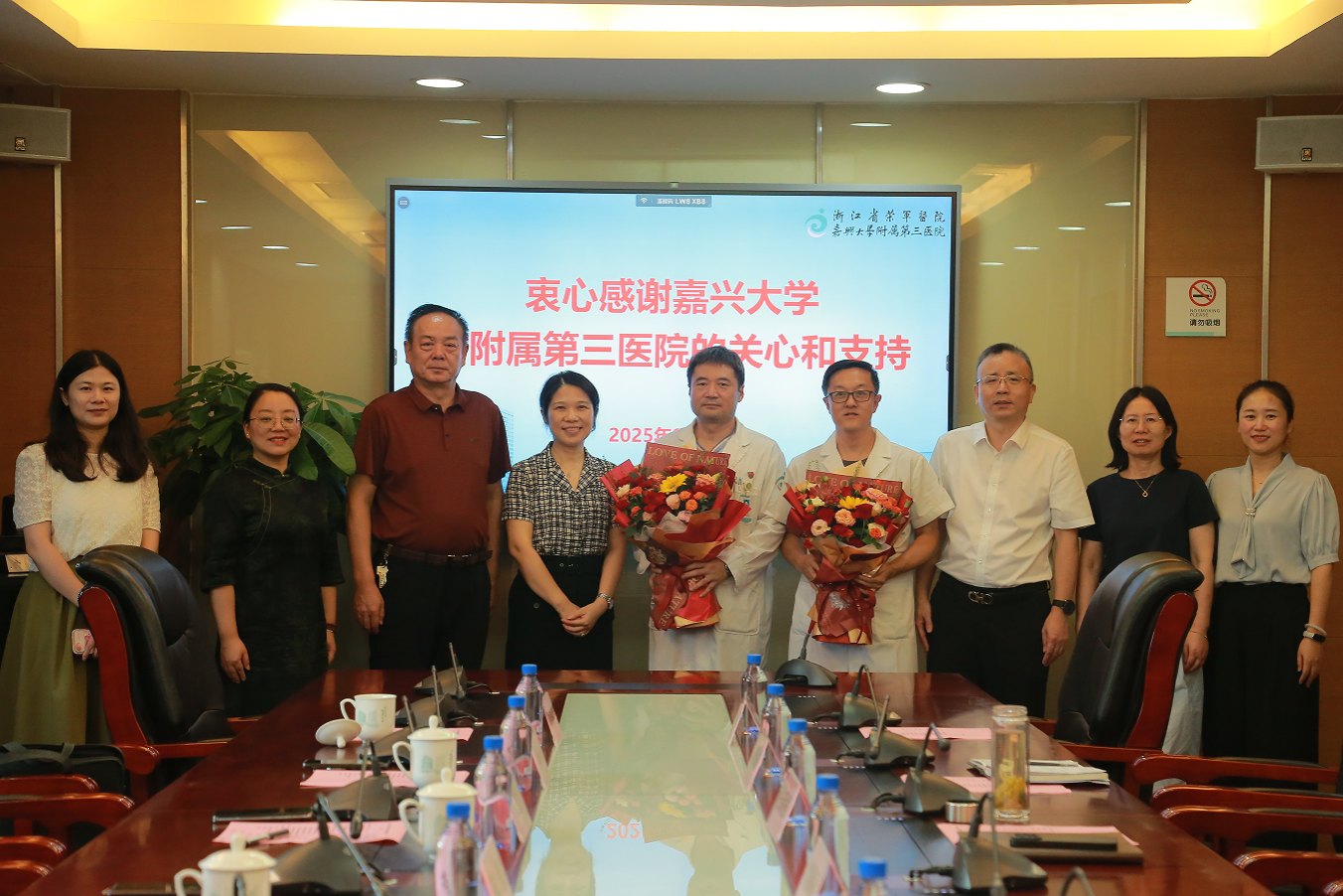 沈希等校领导感谢各附属医院一直以来对学校医学教育工作的支持和付出,希望广大临床教师不断提升医疗水平、教育教学能力、科学研究能力,在医学人才培养与医学科技创新方面为“健康浙江”“健康嘉兴”建设贡献更多“嘉大”力量,努力服务好地方卫生健康事业高质量发展需要。为建设“有特色、善创新的综合性高水平大学”作出更大的贡献。