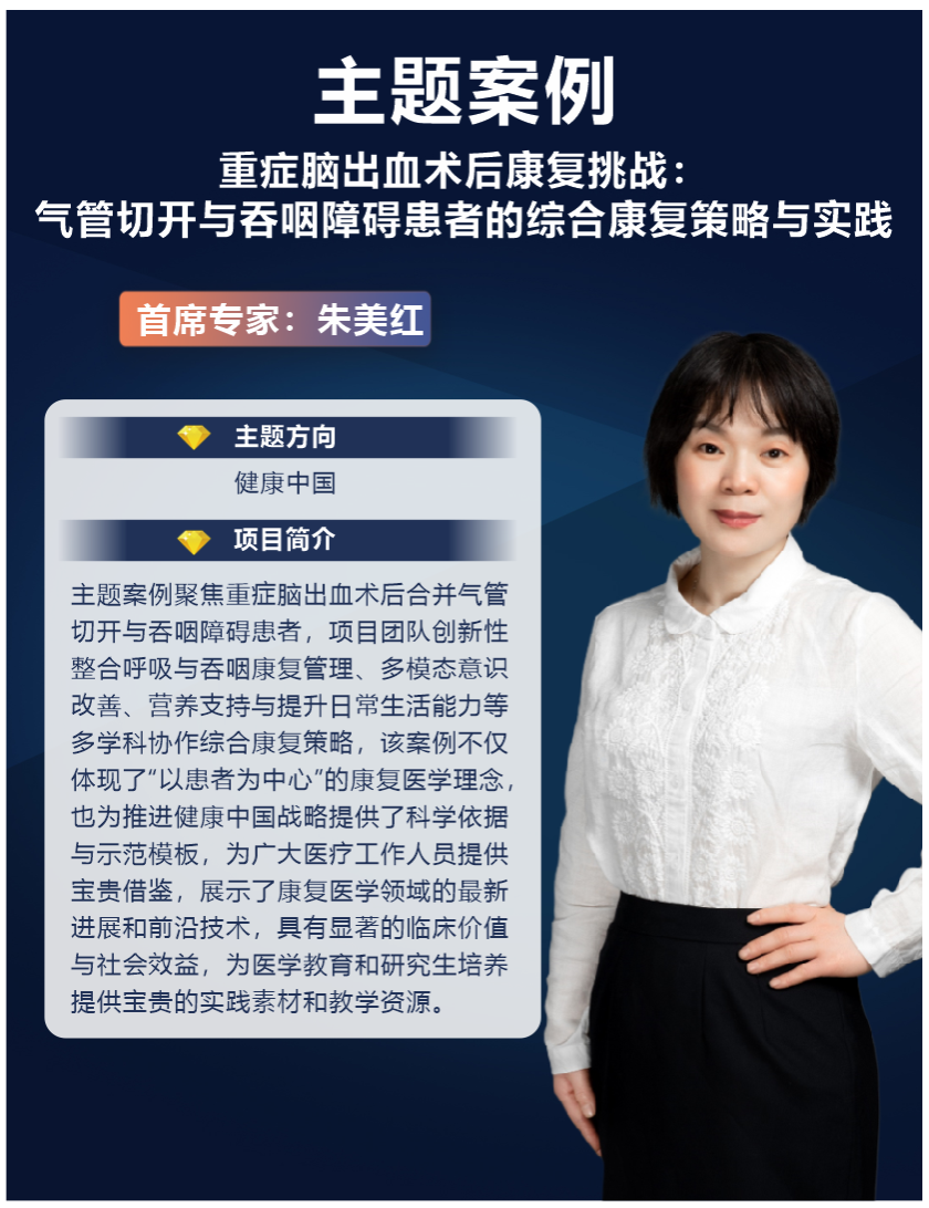 共有3个项目入选,涵盖“新质生产力”“数字中国”“健康中国”三大主题,其中我院护理学专业研究生导师朱美红老师主题案例《重症脑出血术后康复挑战:气管切开与吞咽障碍患者的综合康复策略与实践》成功入选“健康中国”方向。
